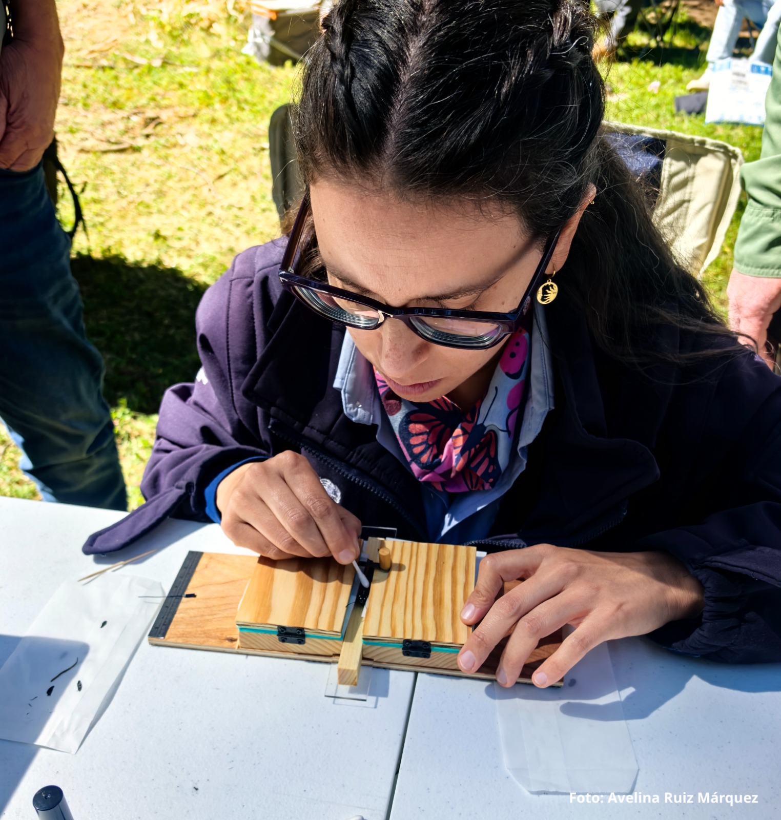 Finalmente, el dispositivo se colocó con delicadeza, se protegen las alas de la mariposa con un papel especial para cuidar sus escamas. Posteriormente, el ejemplar se sujeta en un dispositivo diseñado para evitar cualquier movimiento que pueda lastimarlo, permitiendo fijar el sensor con un pegamento especial.